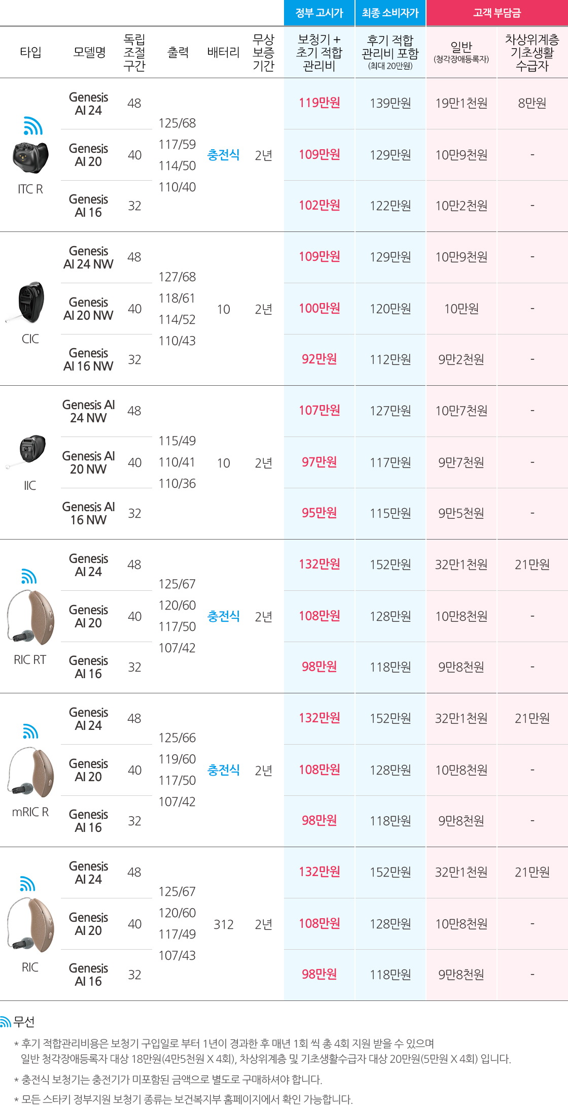 ※ 충전식 보청기는 충전기가 미포함된 금액으로 별도 구매하셔야 합니다. (일반형 충전기: 15만원, 고급형 충전기: 귓속형 25만원, 오픈형·귀걸이형 20만원)